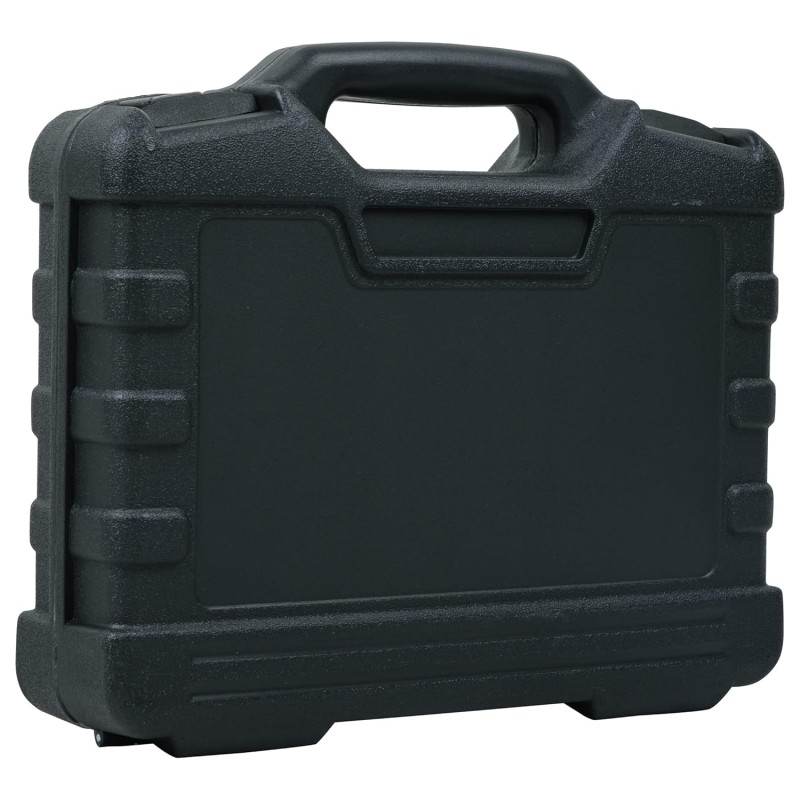This compact set includes screwdrivers, pliers, measuring tape, adjustable wrench, bits, cutter, hammer all arranged neatly in a durable blow-molded carry case for easy organization and portability.