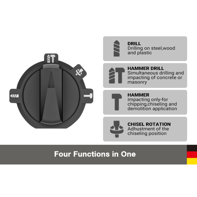 4-in-1 multifunction design: Drill, Hammer Drill, Chisel, Rotation Stop.