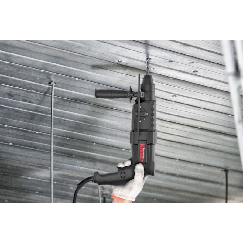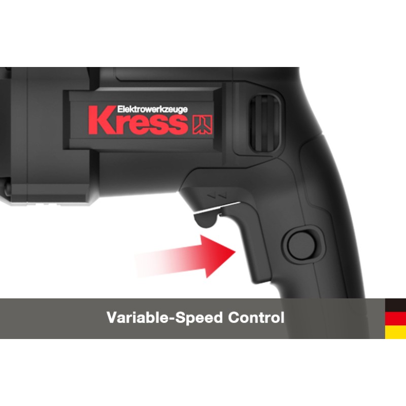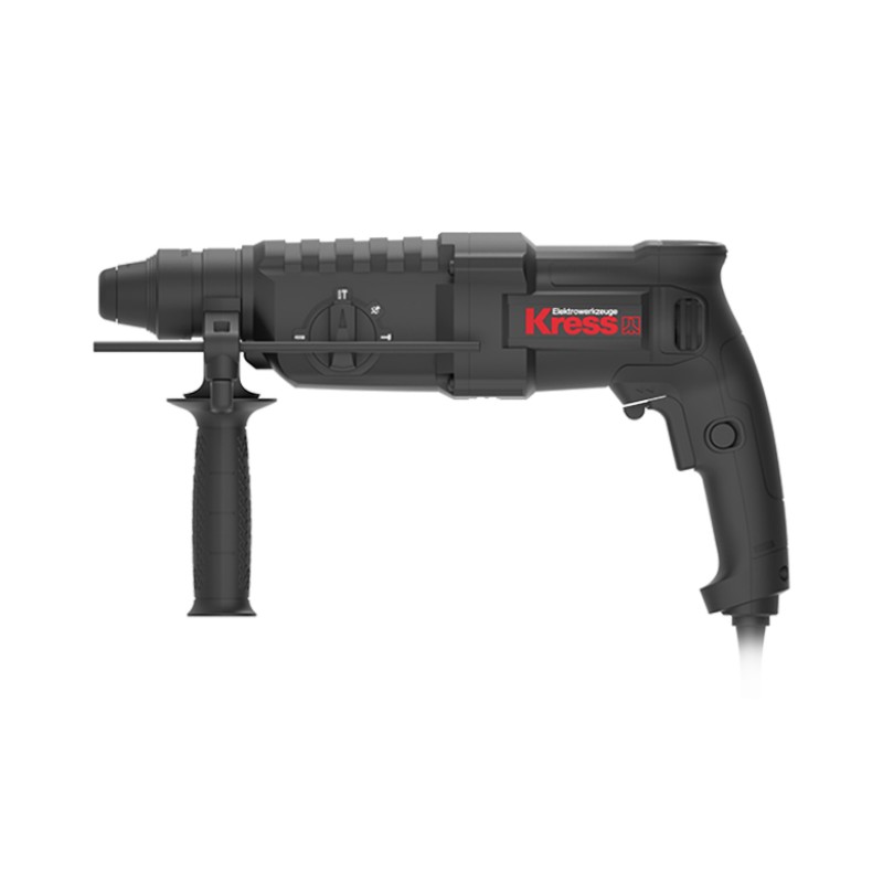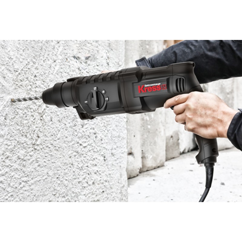 The Kress KU320P 850W Rotary Hammer is a high-performance power tool engineered for heavy-duty drilling, hammering, and chiseling applications. Equipped with a robust 850W motor, it delivers a no-load speed of 0–1300 RPM and an impact rate of 0–5500 BPM, providing an impressive 3.0 Joules of impact energy for efficient material removal.