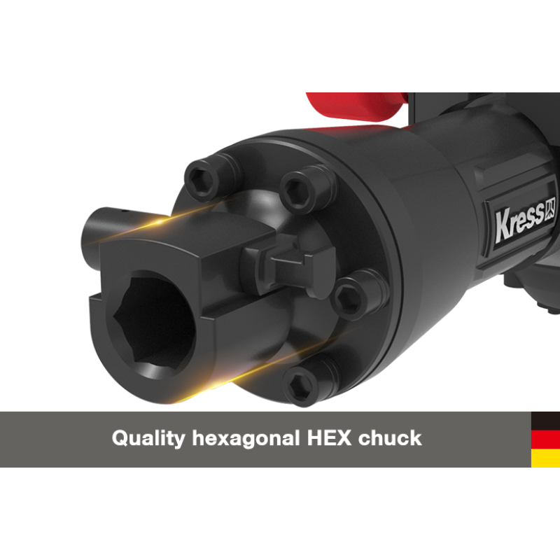 Heavy-duty HEX chuck for secure bit locking and power transfer.
