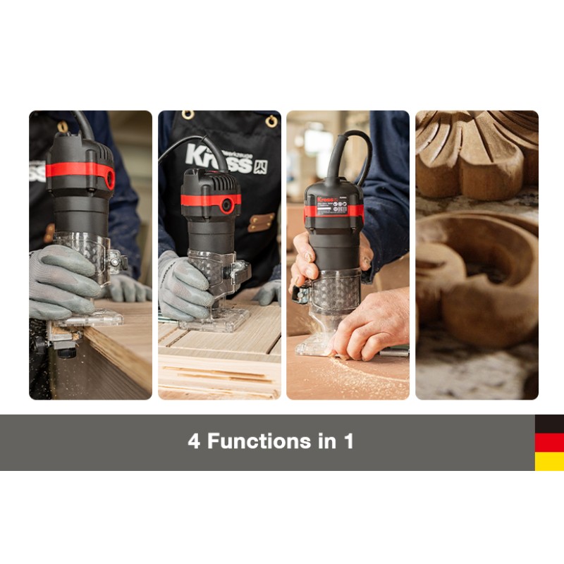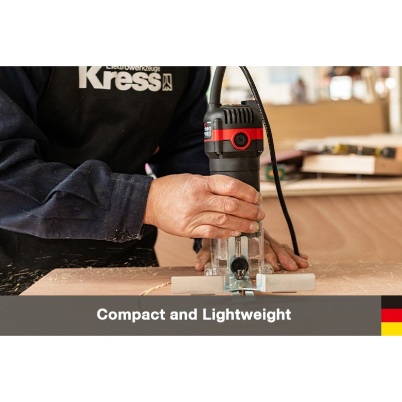 The Kress KU602 550W Palm Router is a compact and high-speed woodworking tool built for professionals and craftsmen who need accuracy and control. Powered by a 550W high-efficiency motor, it reaches speeds up to 33,000 RPM, ensuring smooth trimming, shaping, and grooving on various materials like wood, plastic, and laminate.
