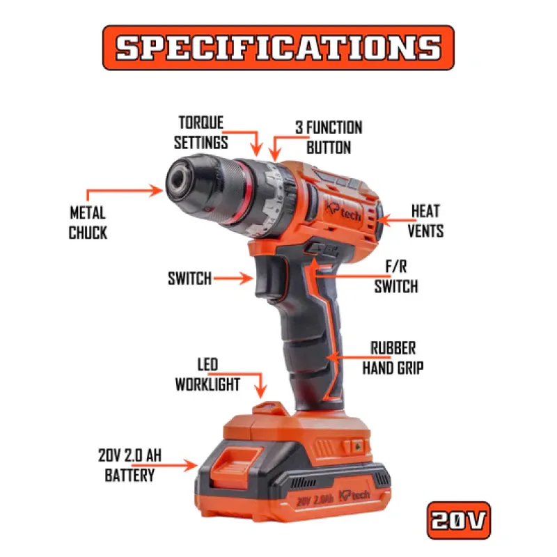 KP Tech 20V Cordless Impact Drill Kit with 47pcs Accessories CLIDK4502
