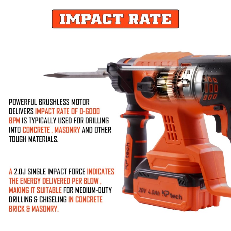 2.0J Impact Energy: Easily drills through concrete, steel, and tough surfaces.