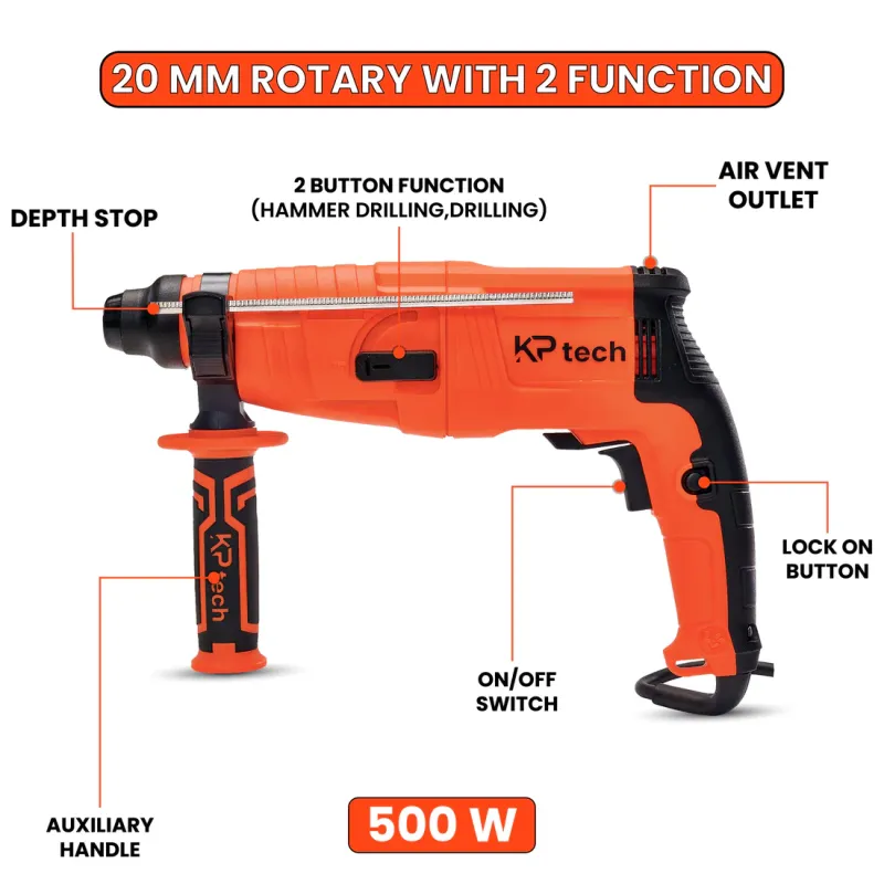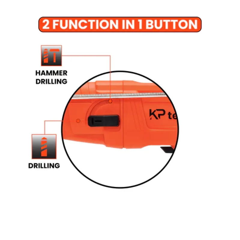 The KP Tech BK–RHD20 Rotary Hammer is a compact yet powerful performer designed for precise drilling and light hammering tasks. Equipped with a 500W high-efficiency motor, it delivers 1.7 Joules of impact energy and an impact rate of 3900 BPM, ensuring quick, smooth drilling in concrete, steel, and wood.