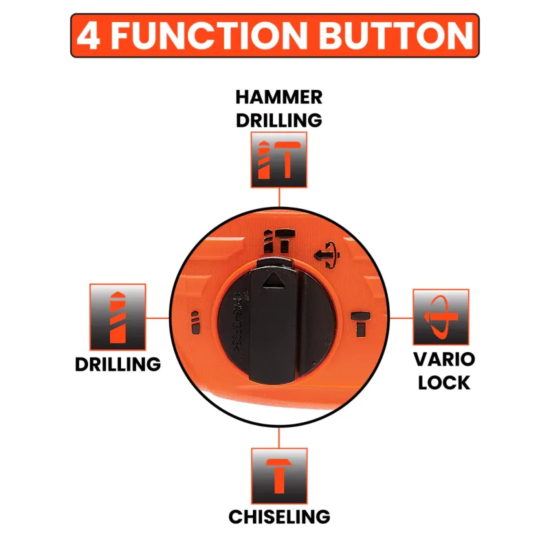 | Functions | 4 Modes – Drill / Hammer Drill / Chisel / Rotation Lock |