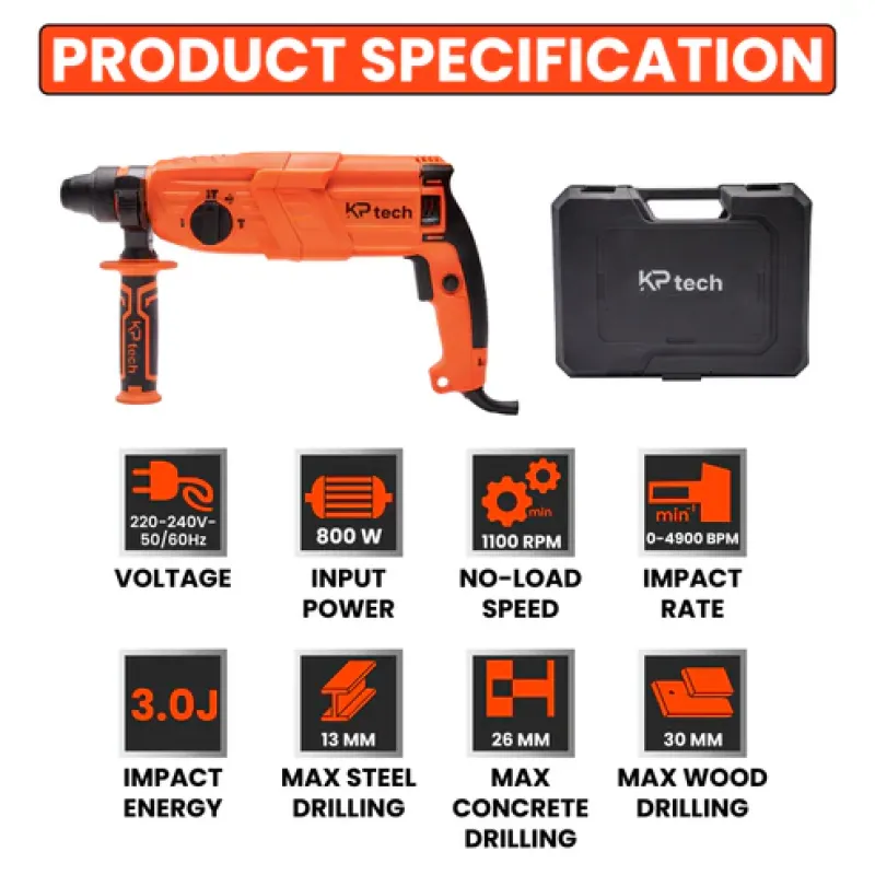 The KP Tech BK–RHD26 Rotary Hammer is a professional-grade 4-function powerhouse designed for drilling, hammer drilling, chiseling, and rotation-only applications.