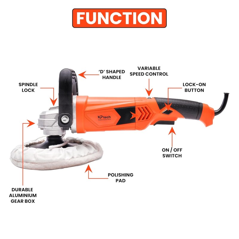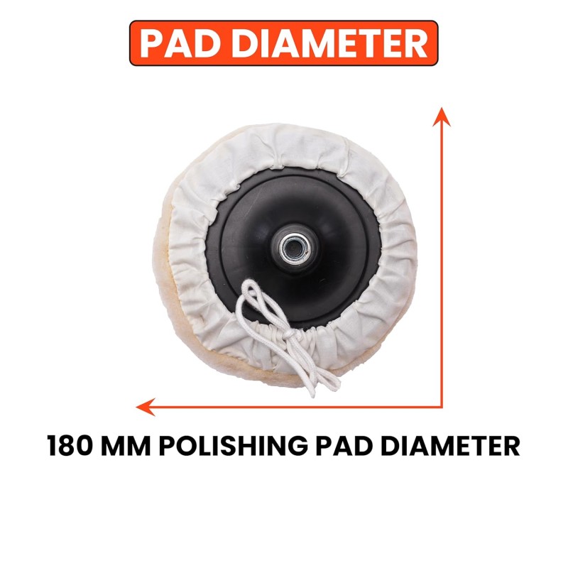 Its large 180mm polishing pad provides wide coverage for faster results, while the M14 spindle thread ensures compatibility with all standard polishing accessories. The durable aluminum gearbox increases tool life, keeps the motor cool, and ensures smooth power transfer for consistent performance.