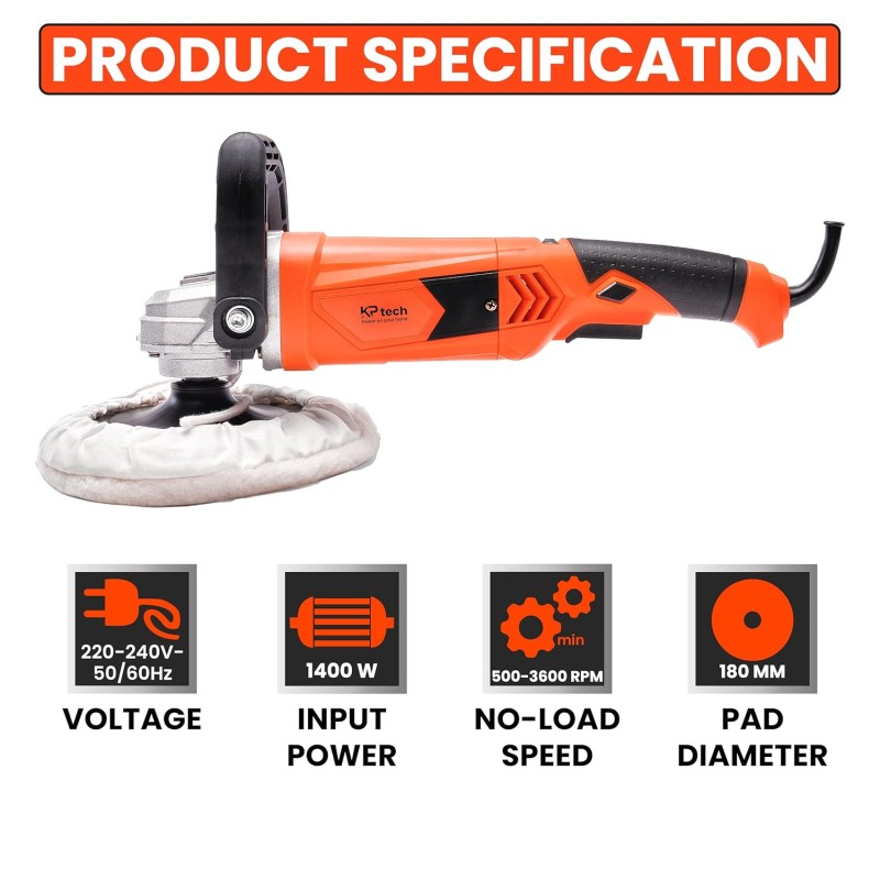 The KP Tech BK–CP1400 Angle Polisher is designed for professionals who demand flawless finishing, high control, and powerful surface treatment. Equipped with a 1400W heavy-duty motor, this polisher delivers a variable speed range of 500–3600 RPM, making it perfect for polishing metal, automotive detailing, stone finishing, and surface restoration.