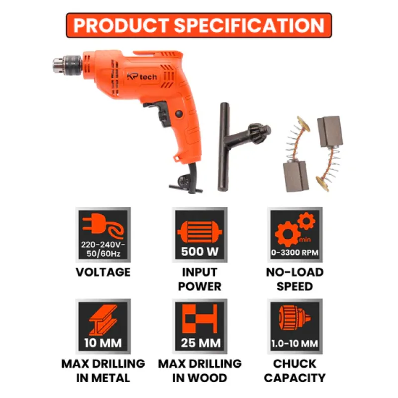 The KP Tech BK–D1050 Electric Drill is a compact, lightweight, and high-speed drilling machine designed for everyday professional use. Powered by a 500W efficient motor, it reaches up to 3300 RPM, delivering fast, clean drilling performance in wood, metal, plastic, and general construction materials.