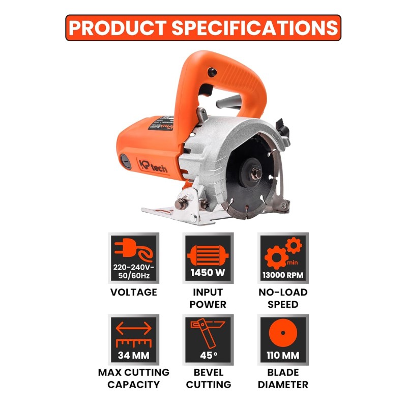 The KP Tech BK–MC1101 Marble Cutter is a high-performance stone-cutting machine designed for precision, power, and durability. Equipped with a strong 1450W motor and a blazing 13,000 RPM, this cutter delivers fast, clean, and accurate cuts across marble, granite, ceramic tiles, concrete blocks, and other rigid materials.