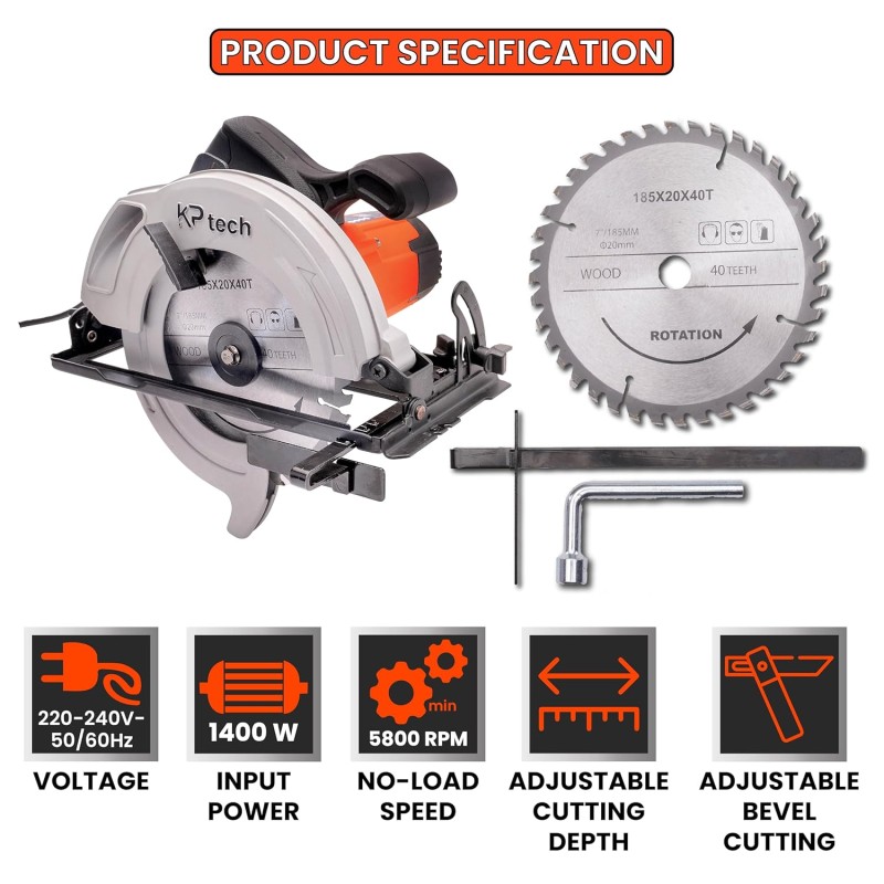 The KP Tech BK–CS185 Circular Saw is a powerful, high-precision cutting machine designed for professionals who demand clean cuts, deep reach, and long-lasting performance. Its 1400W robust motor delivers a fast 5800 RPM, making it ideal for cutting plywood, hardwood, MDF, formwork sheets, aluminum sheets, boards, and construction timber.