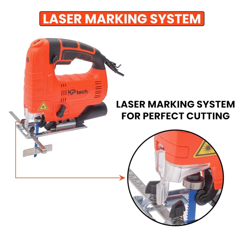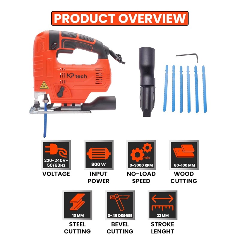 The KP Tech BK–J8001 Jig Saw is a high-performance cutting tool designed for professionals who demand clean, deep cuts, and precise control. Powered by a 800W motor, this jig saw delivers smooth, fast, and consistent performance with a 0–3000 RPM variable speed system, making it perfect for woodworking, metalworking, and intricate detailing.