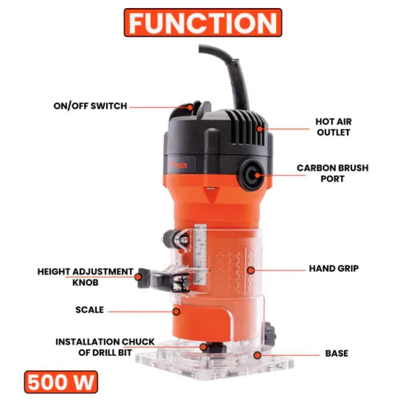 Its 6mm and 1/4" collet compatibility allows the use of a wide range of trimming and profiling bits. Whether you're shaping laminate edges, trimming veneer, rounding corners, or performing decorative cuts, this tool offers exceptional control and smooth finish quality.