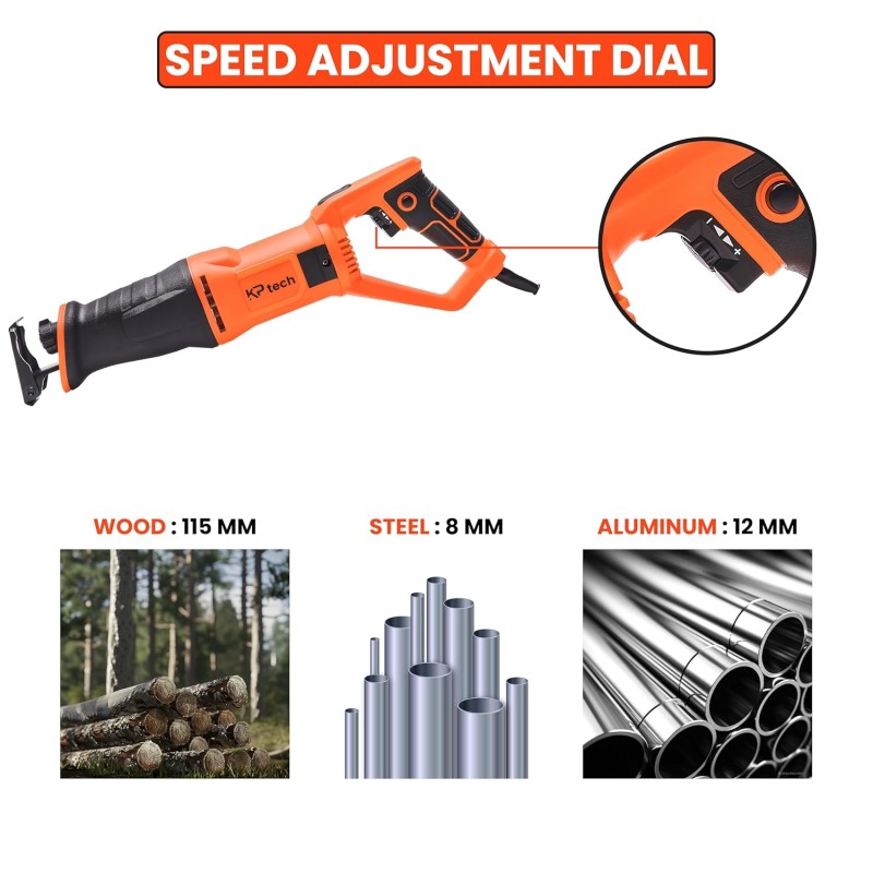 The KP Tech BK–RC800 Reciprocating Saw is built for cutting, demolition, trimming, and heavy-duty site tasks where raw power meets precise control. With an 800W high-torque motor and a 0–2800 RPM variable stroke speed, this machine slices through wood, steel, PVC, aluminum, and even embedded materials with ease.