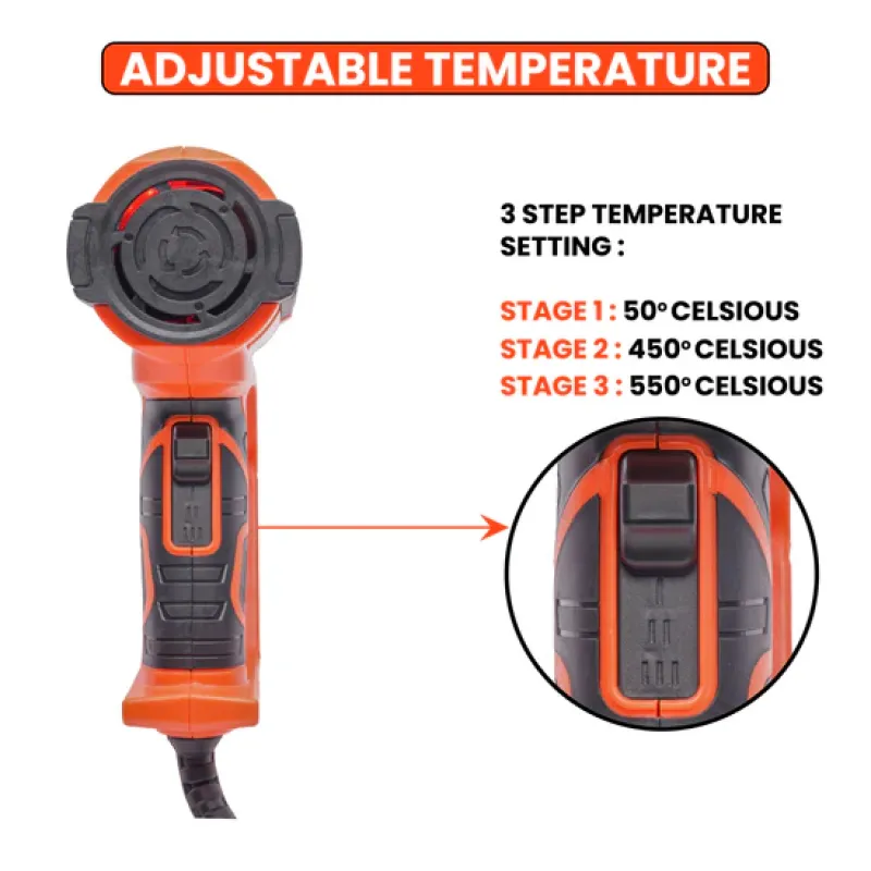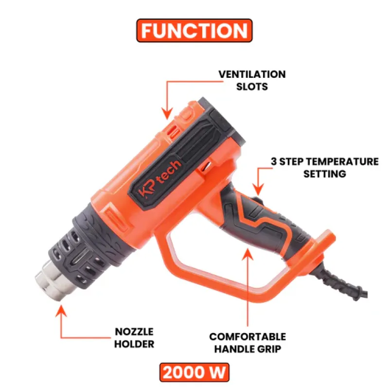 The KP Tech BK–HT2000-A Heat Gun is a powerful and versatile heating tool built for industrial technicians, electricians, renovation experts, and DIY users who want precision and full accessory support. Powered by a 2000W rapid-heating core, this gun offers three temperature levels — 50°C, 450°C, and 550°C — making it ideal for everything from delicate shrink jobs to heavy-duty paint stripping.