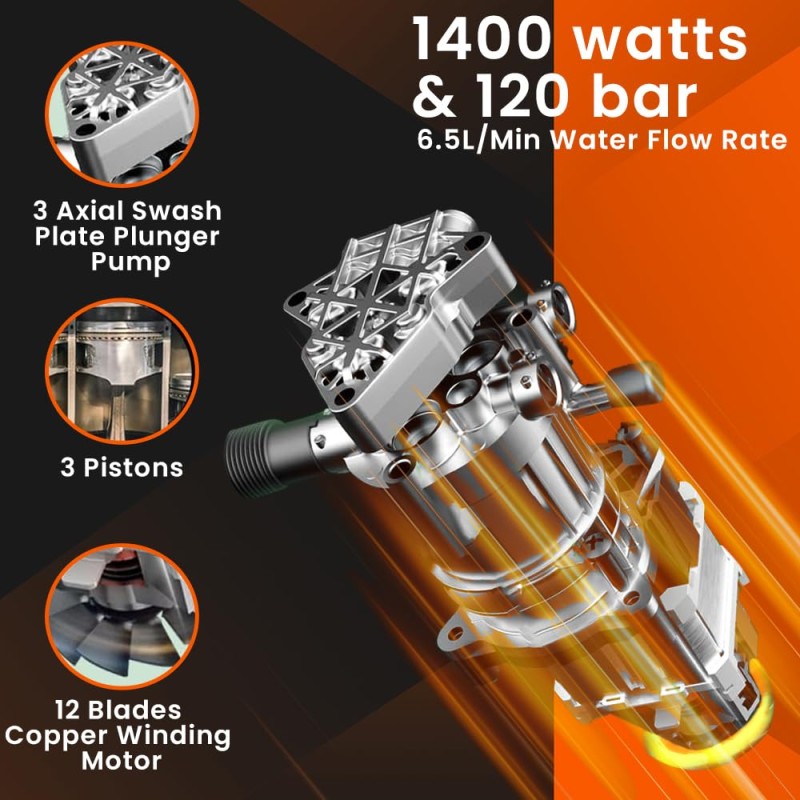 The Auto Stop System ensures the pump runs only when the trigger is pressed, saving power and increasing motor life. Its 3 axial-plunger wobble-plate pump provides stable performance and consistent water flow at 6.5 L/min.