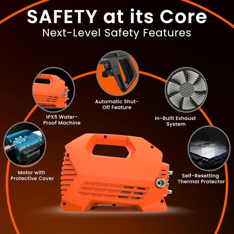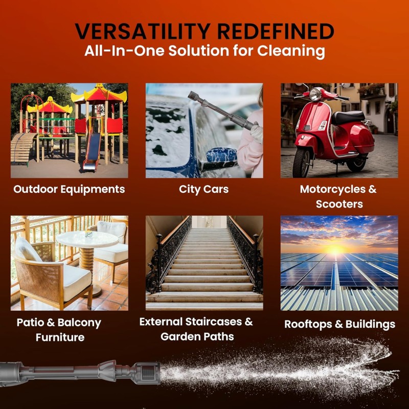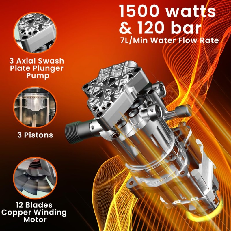120 Bar High Pressure: Removes tough stains & dirt effectively.