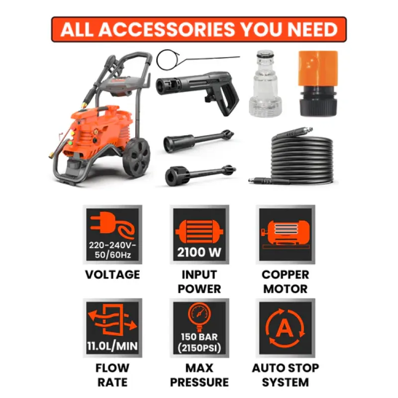 Powered by a 2100W pure copper induction motor and a solid copper pump, this washer delivers a massive 150 Bar (2150 PSI) pressure and an impressive 11.0 L/min flow rate — meaning car, bike, SUV, tractor, tiles, gates, floors, machinery…
