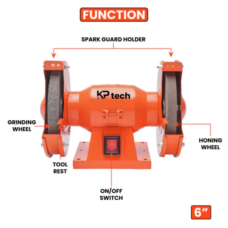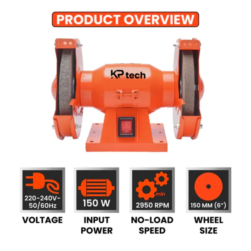 The KP Tech BK-BG1506 Bench Grinder is a compact yet powerful grinding machine designed for sharpening, polishing, rust removal, shaping, and general workshop tasks. Equipped with a 150W motor and running at 2950 RPM, this grinder delivers smooth, consistent performance ideal for DIY users, small workshops, garages, and metalworking studios.
